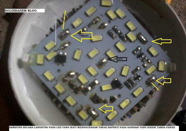 Solusi ;Buang cungkil menggunakan obeng pada led yang mati. Kemudian satukan kedua kaki led yang mati tersebut menggunakan timah/dijumper menggunakan kabel.